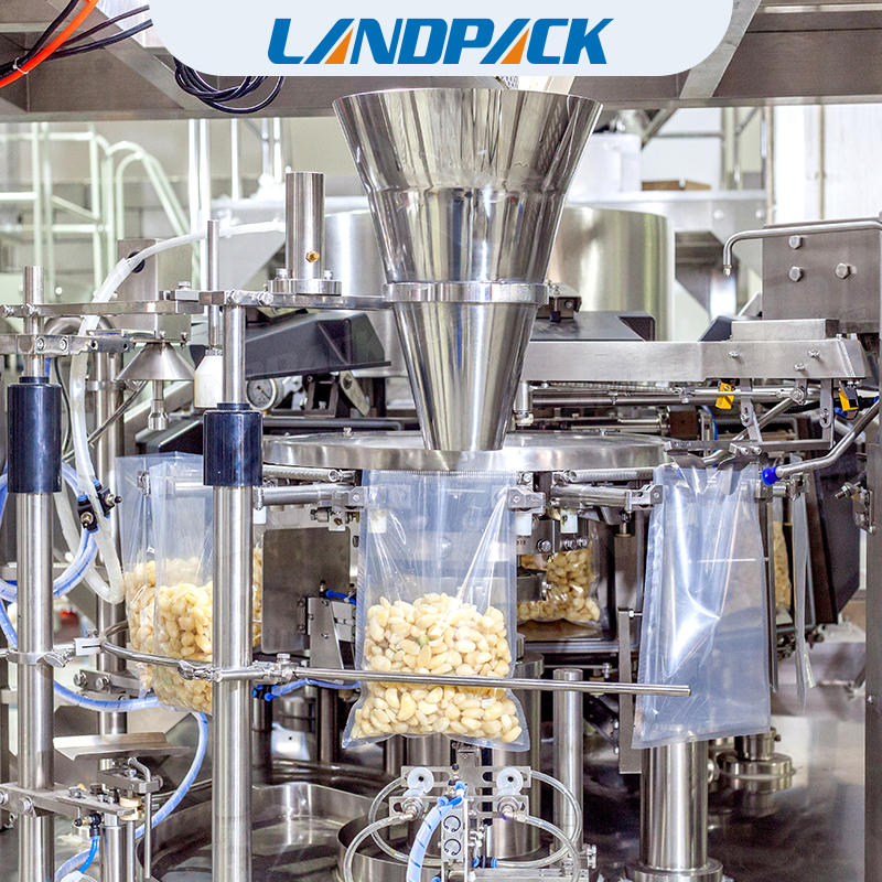 給袋式真空包裝機代替了手工包裝,操作人員只要將做好的一個一個的袋子,一次性將幾百個袋子放在設備的取袋部,設備機械手會自動的取袋、打印日期、開袋、給計量裝置信號計量并落料、封口、輸出。